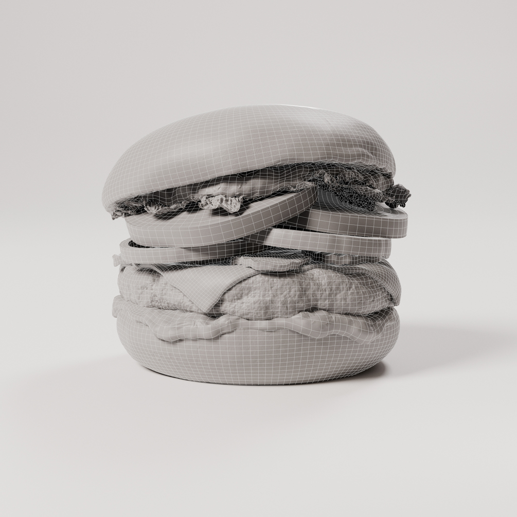 You will receive a burger and burger ingredients with 2k texture maps. It has organized non-overlapping uvs and a decent topology which supports further editing and a lot of detail. With the 3D model (formats: fbx, obj) there is a diffuse, roughness, sss, displacement, opacity and normal map.