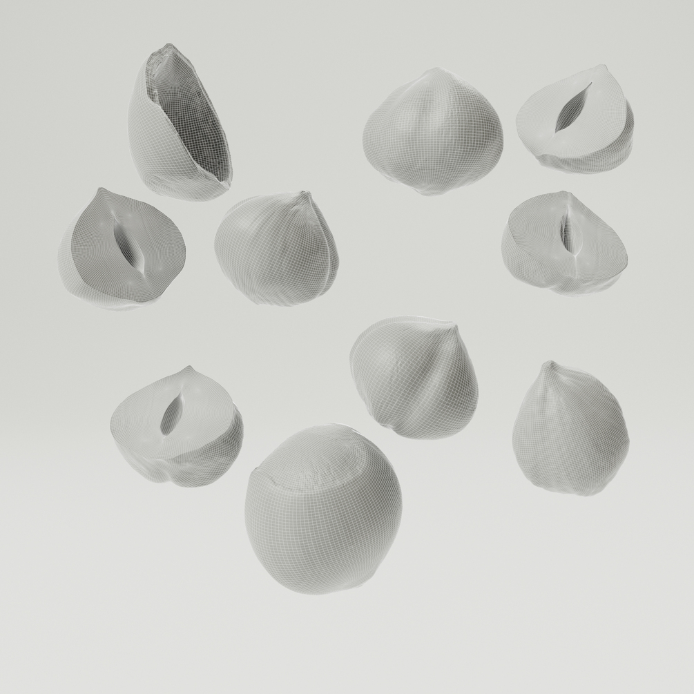 You will receive 10 variation of photorealistic digital hazelnuts (2*full, 2*halves, 2*peeled, 2*peeled cuts, 2*shells) with 8k texture maps. It has organized non-overlapping uvs and a decent topology which supports further editing and a lot of detail. With the 3D model (formats: fbx, obj) there is a diffuse, roughness, displacement, sss and normal map.