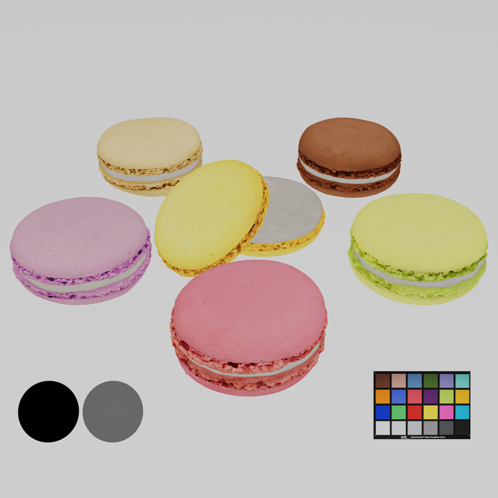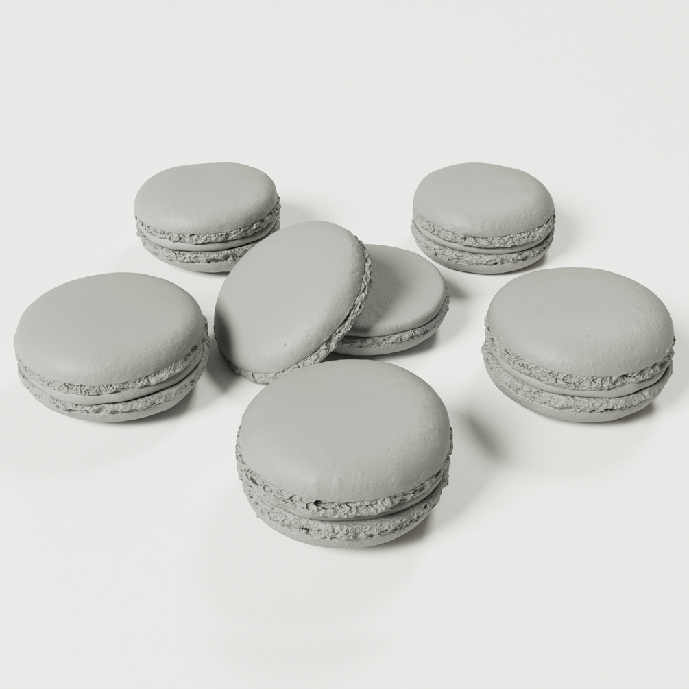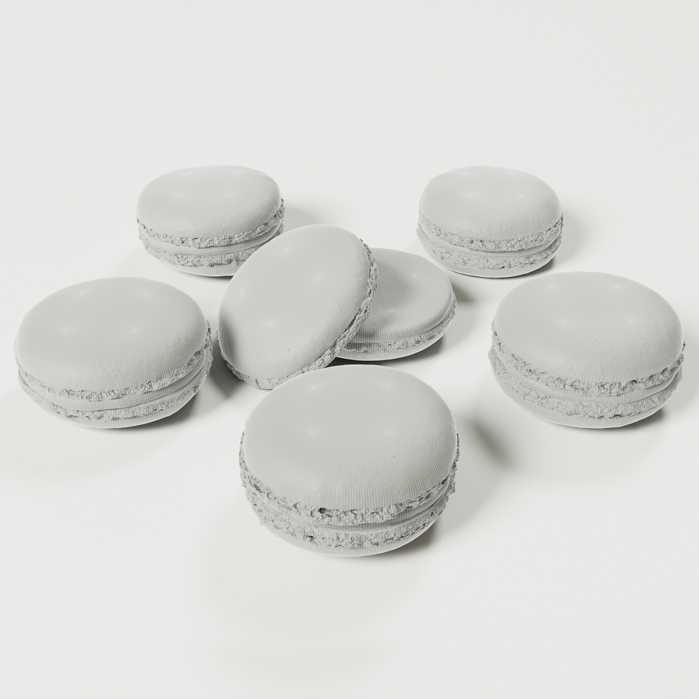You will receive 3 × photorealistic digital macarons (each of them have two different diffuse maps) and 1 x filling with 8k texture maps. It has organized non-overlapping uv`s and a decent topology which supports further editing and a lot of detail. With the 3D model (formats: fbx, obj) there is a diffuse, roughness, displacement, sss and normal map.
