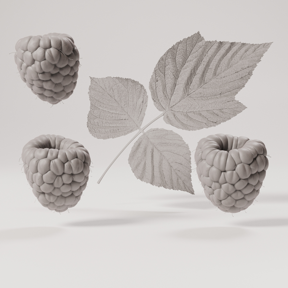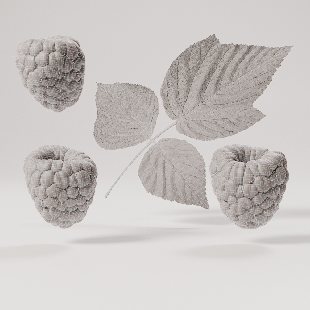 You will receive 3 raspberries and leaves with 8k texture maps. It has organized non-overlapping uvs and a decent topology which supports further editing and a lot of detail. With the 3D model (formats: fbx, obj) there is a diffuse, roughness, sss, displacement, opacity and normal map.